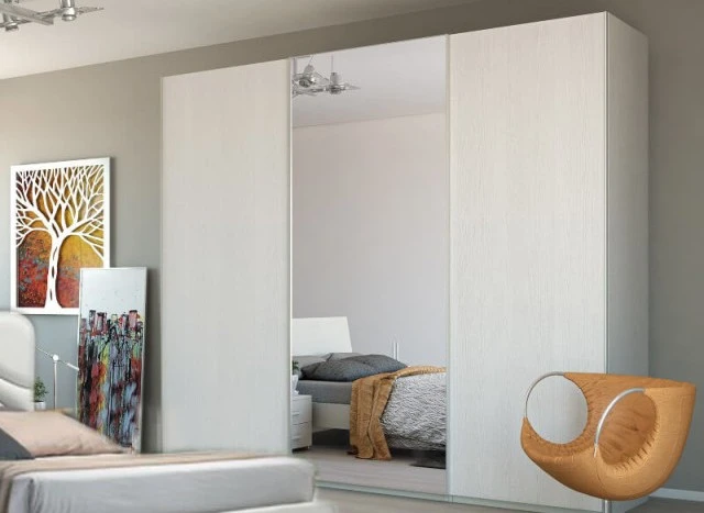 - Armoire 3 portes coulissantes avec miroir central, 5 étagères et 3 tringles