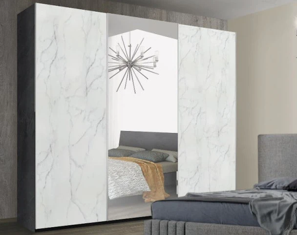 - Armoire 3 portes coulissantes avec miroir central, 5 étagères et 3 tringles