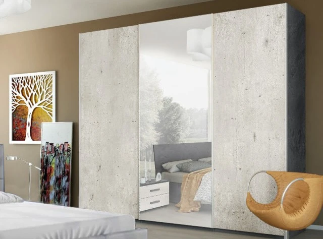 - Armoire 3 portes coulissantes avec miroir central, 5 étagères et 3 tringles