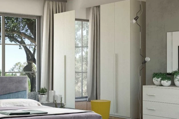 Rangez vos vêtements dans la grande armoire à 6 portes battantes. A l'intérieur, chaque module comprend 2 tubes de cintres séparés par une étagère structurelle.