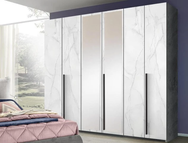- Armoire 6 portes battantes avec miroir central, 5 étagères et 3 tringles